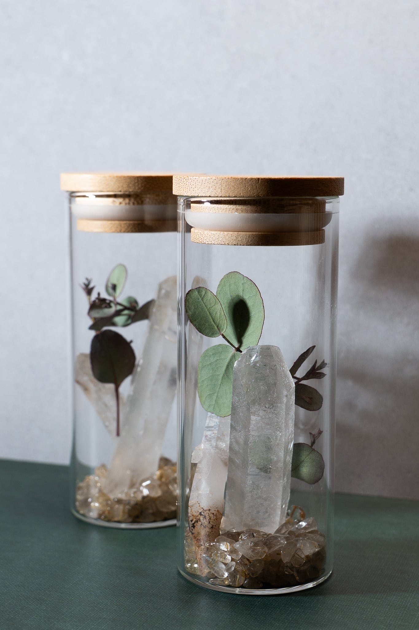 ビンの中(竹製のフタ)にルチルクォーツのさざれ石(約20g)と山梨県産水晶2個を